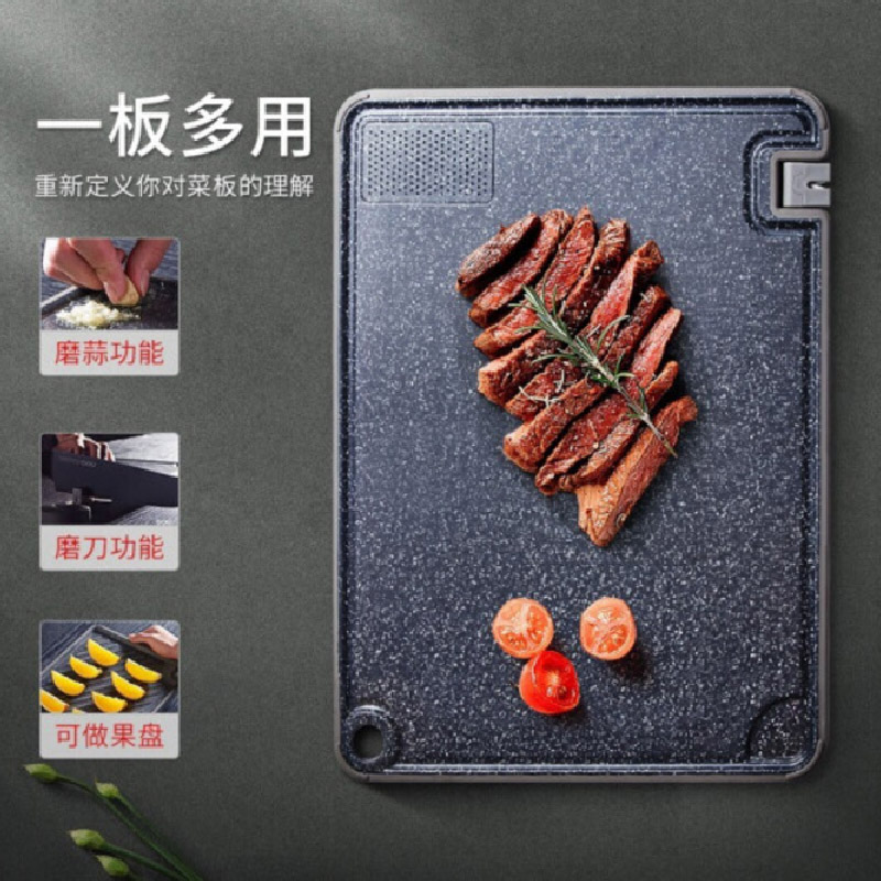 黑刀OOU防霉抗菌多功能菜板 黑色中号37*26cm(案板+磨蒜泥+自带磨刀器+杯垫+果盘)