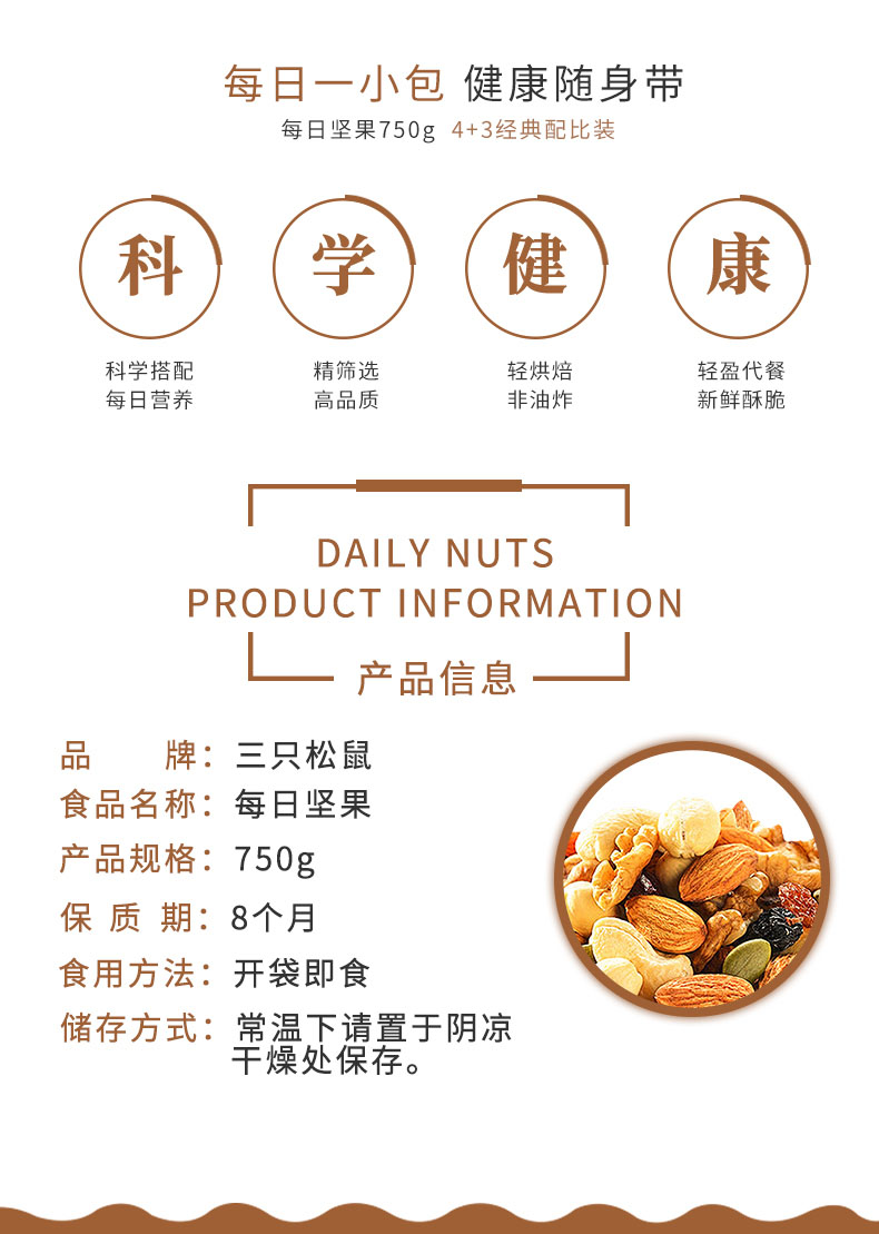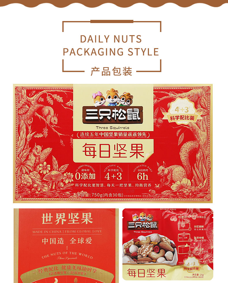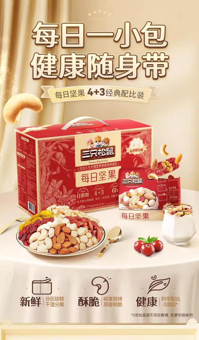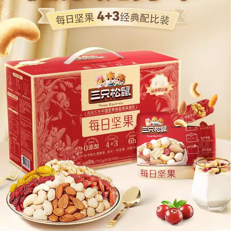 三只松鼠每日坚果礼盒750g(4种坚果+3种果干)共30包