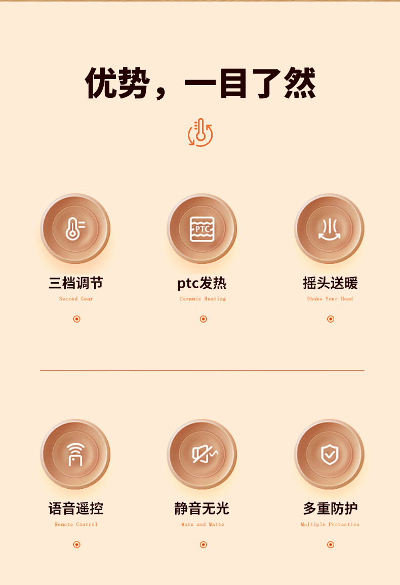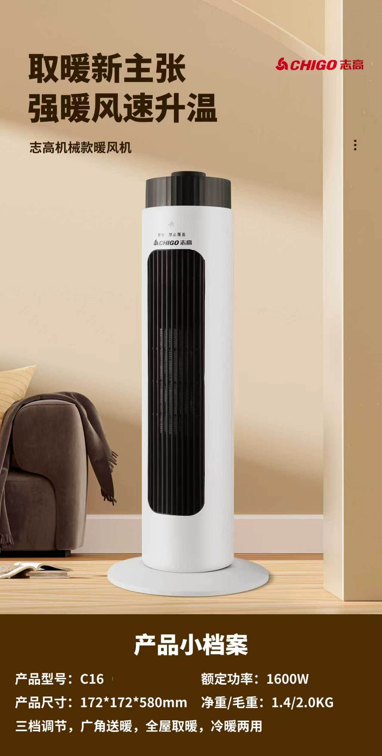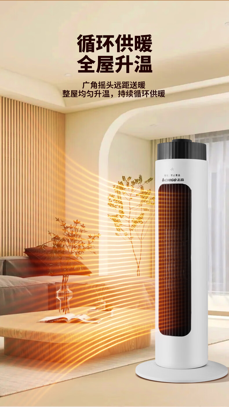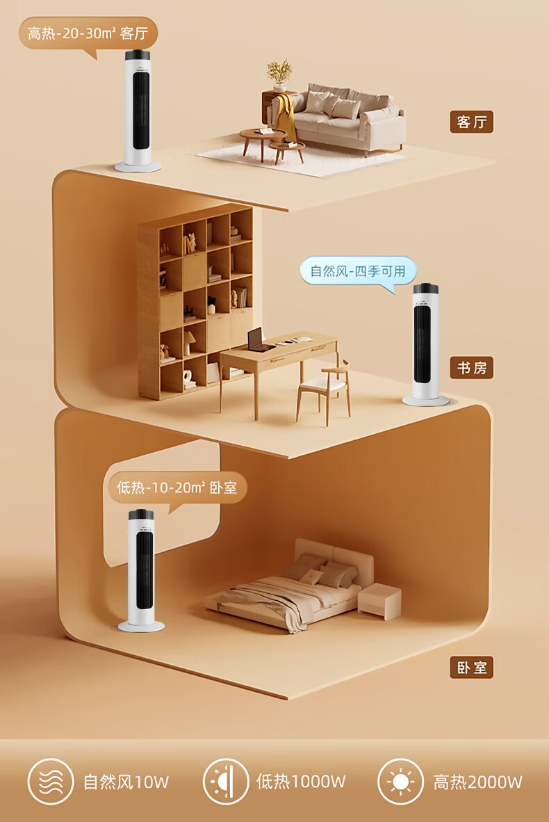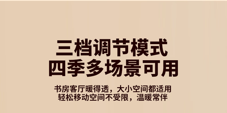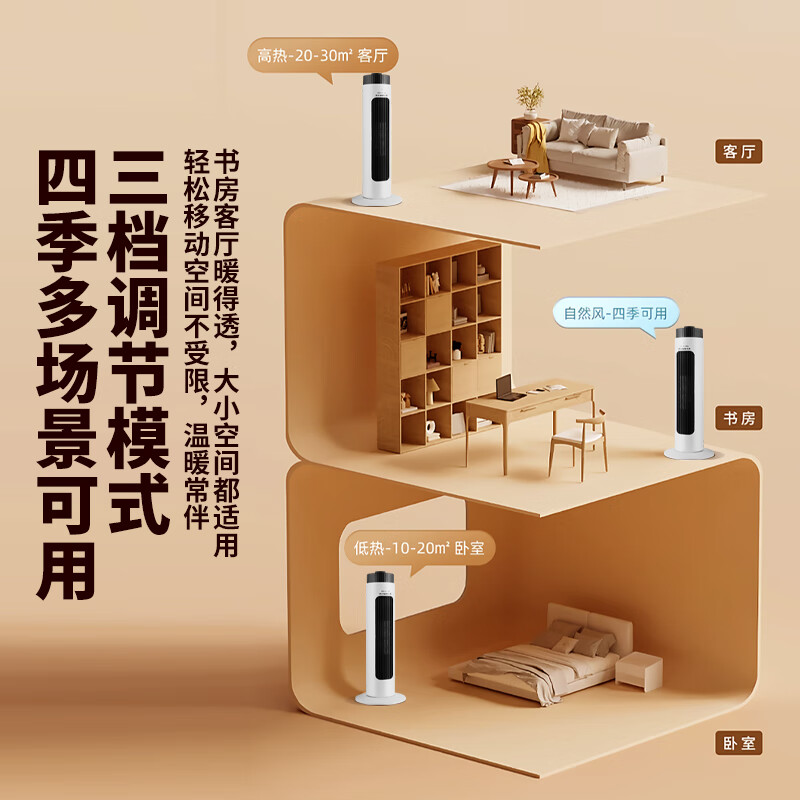 冷暖三档随心换,四季舒适一机搞定!广角摇头,整屋均匀升温